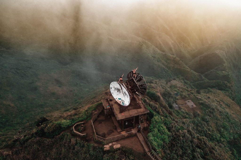 We are at the horizontal walkway that precedes the radio station, here the iron boards are well positioned and well preserved by the nature of the mountain that has made them his own, as a part of himself that it can no longer do without. Here, we feel the strong call of God, free from everything. We see neither Kaneohe nor the horizon. We perceive with our senses every truth that surrounds us. The gods of Hawaii are everywhere.