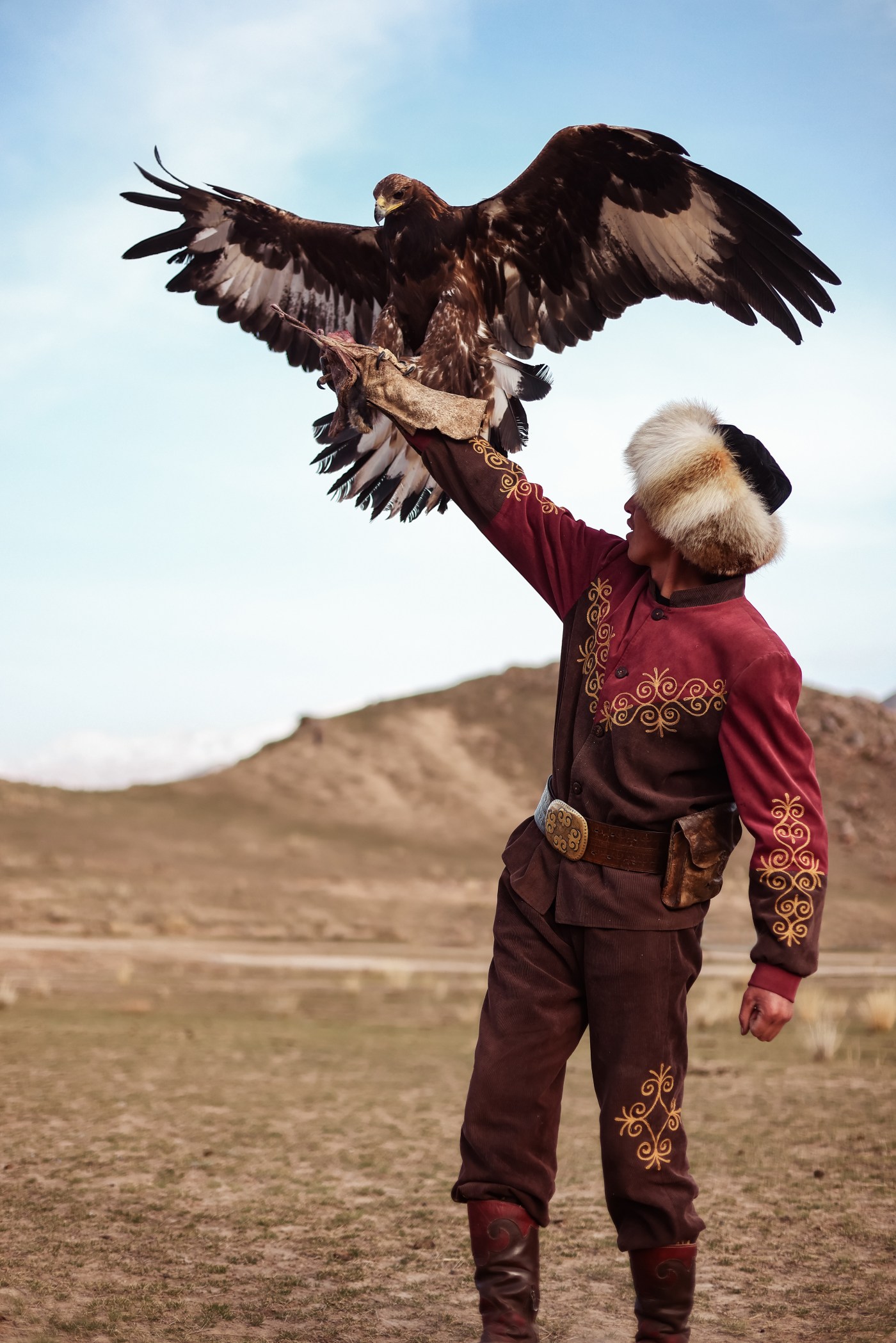 The bond between the hunter and the eagle begins when the hunters capture the baby eaglets from their nest, taking advantage of the moment when the mother is looking for food. Only female eagles are used for hunting, as they are naturally larger than males, with a wingspan that can reach 2.5 metres, but mainly because females are more ferocious hunters.
