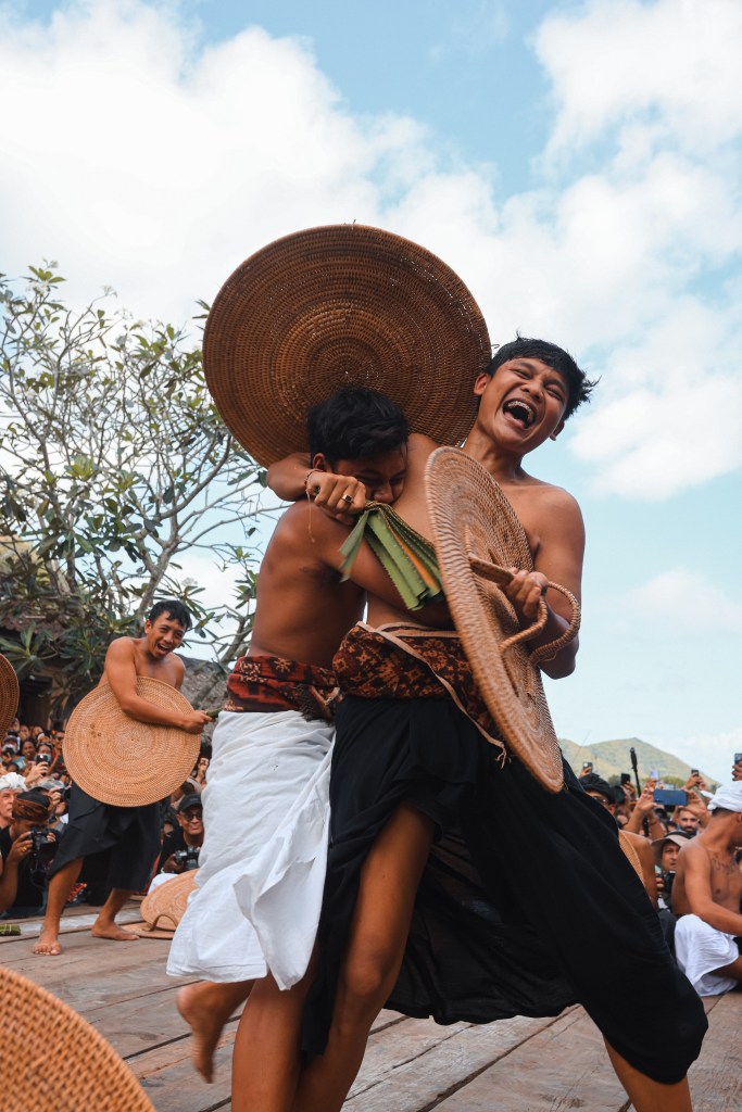 Il rituale inizia con canti e danze tradizionali, seguiti dalla benedizione dei sacerdoti del villaggio. Alle dieci del mattino, le donne, vestite del loro migliore ikat Gerinseng – l’ikat è il famoso tessuto che rende il villaggio celebre in tutta l’Asia – partecipano alla cerimonia propiziatoria celebrata dai due sacerdoti del villaggio. Poi, al suono del tamburo e del gamelan, i combattenti entrano nell’arena, pronti a sfidarsi. La battaglia è intensa: i partecipanti si colpiscono reciprocamente con le foglie di pandanus, cercando di graffiare e ferire l’avversario. Nonostante l’apparente violenza, lo spirito dell’evento è di amicizia e rispetto reciproco.
