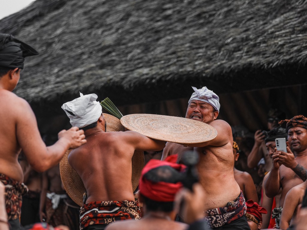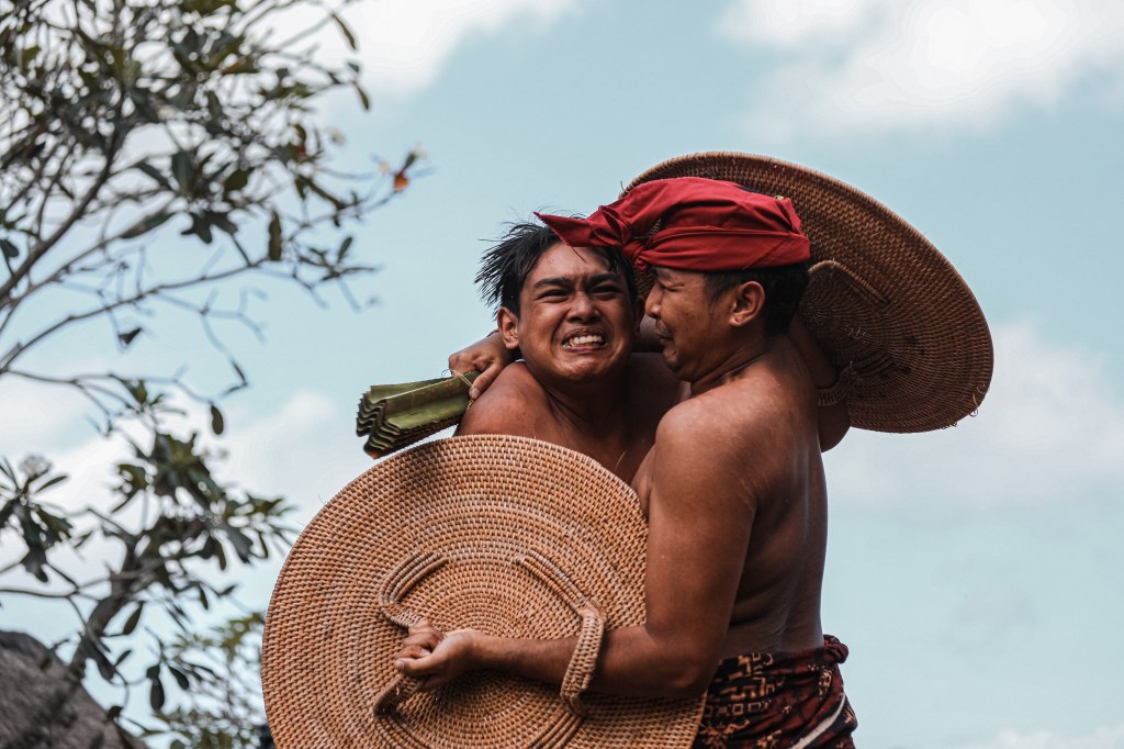 Le grida degli adulti incitano i due combattenti che si scagliano l’uno contro l’altro per il dio Indra, il dio della guerra. In mano hanno le rigide e spinose foglie di pandan, un arbusto verde che cresce sull’isola.